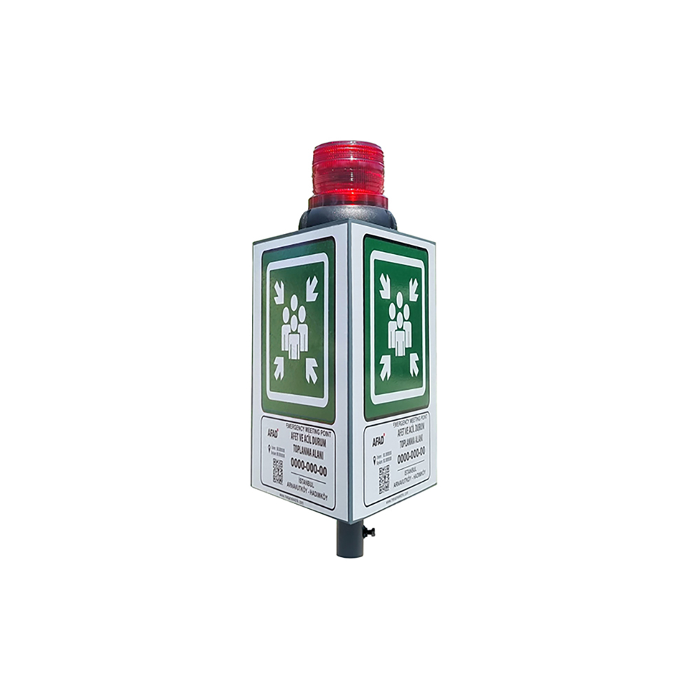 Güneş Enerjili İkazlı Acil Toplanma Alanı Tabelası Üç YönlüEmergency Assembly Area with Solar Beacon360 dereceden görünmektedir.Anlık ışık geçişlerinden etkilenmez ve çalışmaya devam eder.Optimize edilmiş Polikarbonat lensi sayesinde yüksek ışık yayımı yapar.UV ışınlarından etkilenmez.IP66 koruma sınıfında olup,dış ortama uygundur. Bilgi Levhaları, Nerede ve Hangi Alanlarda Kullanılır?⋙ Şehir içi toplanma alanlarında, hoteller, metro,⋙ Ücretli veya ücretsiz tüm otopark toplanma noktalarında⋙ Park alanı / yeri bulunan alanlarda, araç ve yayaları bilgilendirmek amacıyla ⋙ Geniş kullanım alanı: Yol kenarlarında, park alanlarında, sosyal alanlarda, güvenlik gerektiren her türlü alanda kullanılmaktadır.T.C. İÇİŞLERİ BAKANLIĞI Afet ve Acil Durum Yönetimi Başkanlığı yönetmeliğine uygun olarak hazırlanır.Direk hariçtir. 30x40cm gövdeLamba yüksekliği 14cm5cm boruya uygun