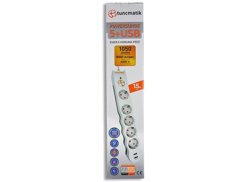 Tunçmatik Beşli Akım Korumalı Priz 2 USB'li Beyaz Powersurge TSK5015Tunçmatik Beşli Akım Korumalı Priz 2 USB'li Beyaz Powersurge TSK5015